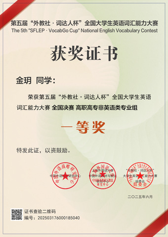 近日,第五屆“外教社·詞達人杯”全國大學生英語詞匯能力大賽落幕。國際商務與旅游學院國際經濟與貿易專業2024級金玥同學斬獲高職高專非英語專業組全國一等獎。
