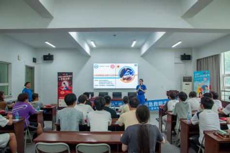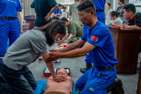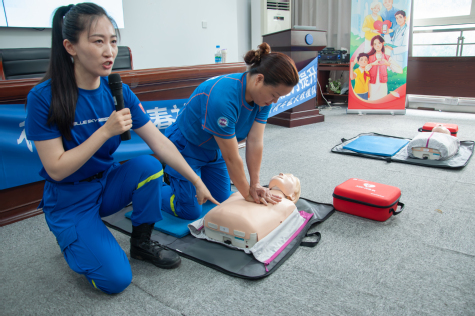 培訓現場,藍天救援隊的講解員首先以真實案例引入,結合視頻資料講解在緊急情況下撥打120的要點,接著介紹了心肺復蘇術的標準流程、自動體外除顫儀的適用情況,以及氣道梗阻急救方法的要點,每一個環節都講解得細致入微。