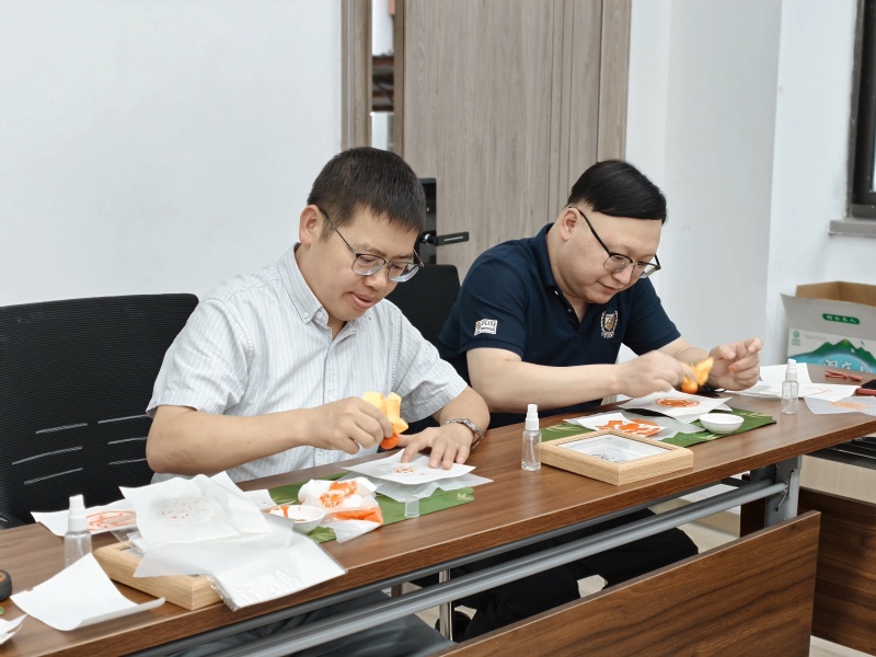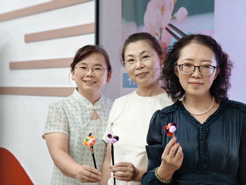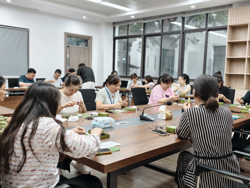 在活動中,女教師學習體驗了非遺絨花制作。教師們經過打尖、傳花、粘花等繁復工序在指尖綻放出精巧花韻,從中也感受到了春風化雨,潤物無聲 的師者情懷:在日復一日地耕耘中,為學生的健康成長編織出絢爛而堅韌的精神之花。男教師學習體驗了金石拓印技術,以細膩手法復刻瓦當圖案。為精準捕捉圖案紋理,教師們在潤紙、蘸墨、上墨等過程中處處體現出了極強的耐心和細心,正如日常教學中以嚴謹態度傳授學問,以高尚品格浸潤心靈,使“立德樹人”的初心如拓印般清晰、端正、有力量。