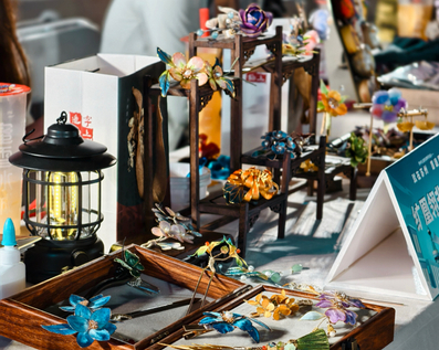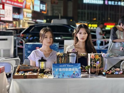 夜集市現場,兩位成員化身非遺文化的“傳承者”與“推廣者”。在文化講解區,社員們以專業的知識儲備,清晰呈現絨花從古代宮廷珍品到現代非遺符號的千年歷史脈絡,助力市民深度感知這門傳統技藝的文化底蘊;在技藝體驗區,蔣嬌嬌和張詩埼耐心示范蠶絲梳理、絨條塑形等關鍵工藝步驟,手把手指導市民以捻、彎、折技法制作簡易絨花造型,在互動實踐中夯實非遺傳承的文化根基;售賣區里,社員自主設計的絨花文創產品品類豐富,古風發簪、發釵款式各異:或以牡丹、蘭花、荷花等傳統花卉為原型,打造雍容雅致的造型;或搭配珍珠、流蘇等元素,呈現靈動婉約的風格。