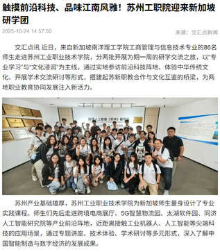 交匯點訊 近日,來自新加坡南洋理工學院工商管理與信息技術專業的86名師生走進蘇州工業職業技術學院,分兩批開展為期一周的研學交流之旅,以“專業學習”與“文化浸潤”為主線,通過實地參訪前沿科技陣地、體驗中華傳統文化、開展學術交流研討等形式,搭建起蘇新職教合作與文化互鑒的橋梁,為兩地職業教育協同發展注入新活力。