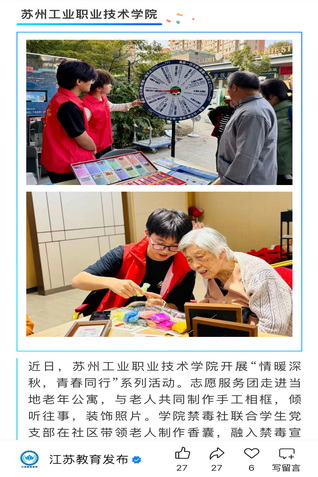 近日,蘇州工業職業技術學院開展“情暖深秋,青春同行”系列活動。志愿服務團走進當地老年公寓,與老人共同制作手工相框,傾聽往事,裝飾照片。學院禁毒社聯合學生黨支部在社區帶領老人制作香囊,融入禁毒宣傳,傳遞健康理念。學院還發起“一封家書”和“收集與家人合影”活動,鼓勵學生書寫家信、分享合影,表達對親人的感恩與思念。