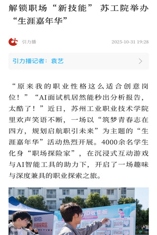“原來我的職業性格這么適合創意崗位!”“AI面試機居然能秒出分析報告,太酷了!”近日,蘇州工業職業技術學院里歡聲笑語不斷,一場以“筑夢青春志在四方,規劃啟航職引未來”為主題的“生涯嘉年華”活動熱烈開展。4000余名學生化身“職場探險家”,在沉浸式互動游戲與AI智能工具的助力下,開啟了一場趣味與深度兼具的職業探索之旅。