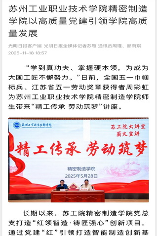 長(zhǎng)期以來(lái),蘇工院精密制造學(xué)院黨總支打造“紅領(lǐng)智造·鑄匠強(qiáng)心”創(chuàng)新項(xiàng)目,通過(guò)黨建“紅”引領(lǐng)打造智能制造創(chuàng)新基地,引導(dǎo)師生自覺(jué)弘揚(yáng)工匠精神,堅(jiān)定走技能成才、技能報(bào)國(guó)之路。