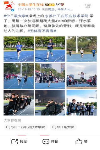 #今日最大學#操場上的@蘇州工業職業技術學院 學子,用每一次加速和起跳丈量心中的夢想;汗水落地,脈搏與心跳同頻。奮勇爭先的背影,就是青春最動人的注腳。#無體育不青春#